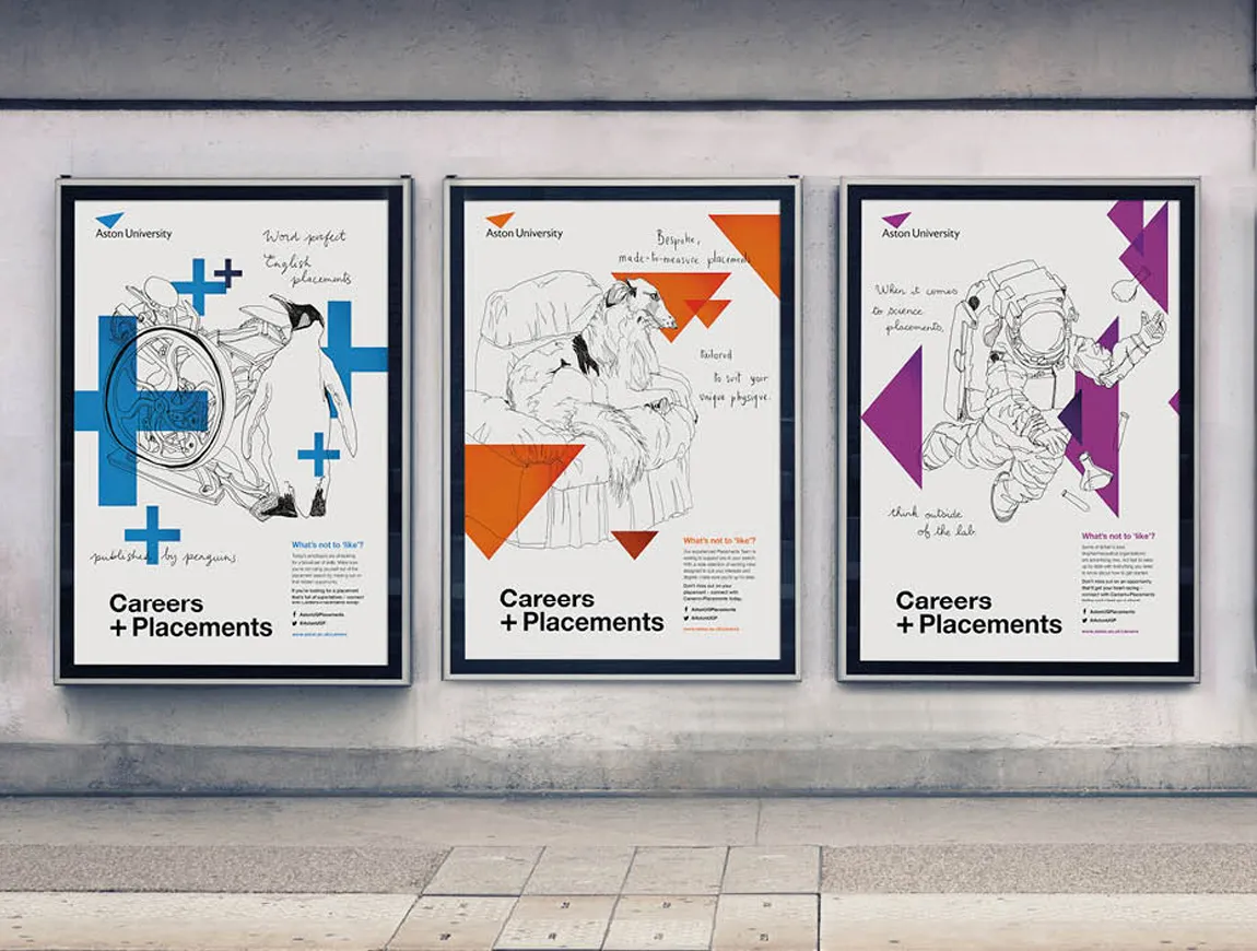 Aston University’s newly named Careers+Placements also took an illustrative approach, but could hardly be more different. IE Brand developed a highly distinctive identity featuring a playful tone of voice and an urban, edgy visual style. We crafted a suite of hand drawn illustrations and arresting statements to engage students at a highly emotive level. The cherry on the cake was a huge wall graphic, designed to interrupt student journeys on campus and stimulate social media engagement.